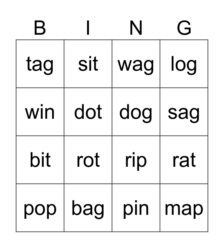 This bingo card has 16 words: bag, rat, wag, tag, bit, sit, rip, pin, win, dot, pop, log, rot, sag, dog and map.