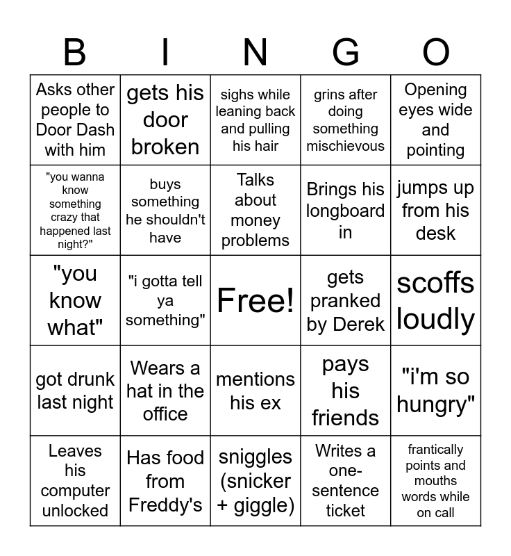 This bingo card has a free space and 24 words: Wears a hat in the office, Has food from Freddy's, Talks about money problems, Leaves his computer unlocked, Opening eyes wide and pointing, Asks other people to Door Dash with him, "you wanna know something crazy that happened last night?", gets his door broken, gets pranked by Derek, mentions his ex, Brings his longboard in, "you know what", pays his friends, "i'm so hungry", buys something he shouldn't have, Writes a one-sentence ticket, scoffs loudly, sighs while leaning back and pulling his hair, jumps up from his desk, "i gotta tell ya something", frantically points and mouths words while on call, got drunk last night, grins after doing something mischievous and sniggles (snicker + giggle).