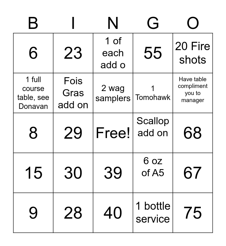 This bingo card has a free space and 75 words: Sell all the mezcal items, 6oz Kobe, 1 of each add o, Caviar, wagyu & lobster, 2 wagyu, $250+ bottle of wine, Casa Fortuna not returned, 1 bottle service, Lobster add on, 3 bottles of wine, bone & tommy, Scallop add on, Have table compliment you to manager, $65 or more drink, Fois Gras add on, omakase, 6 oz of A5, $200 bottle of wine, 1 full course table, see Donavan, Top Cap, 2 wag samplers, 1 Tomohawk, 20 Fire shots, 6, 21, 35, 51, 66, 7, 22, 36, 52, 67, 8, 23, 37, 53, 68, 9, 24, 38, 54, 69, 10, 25, 39, 55, 70, 11, 26, 40, 56, 71, 12, 27, 41, 57, 72, 13, 28, 42, 58, 73, 14, 29, 43, 59, 74, 15, 30, 44, 60, 75 and 45.