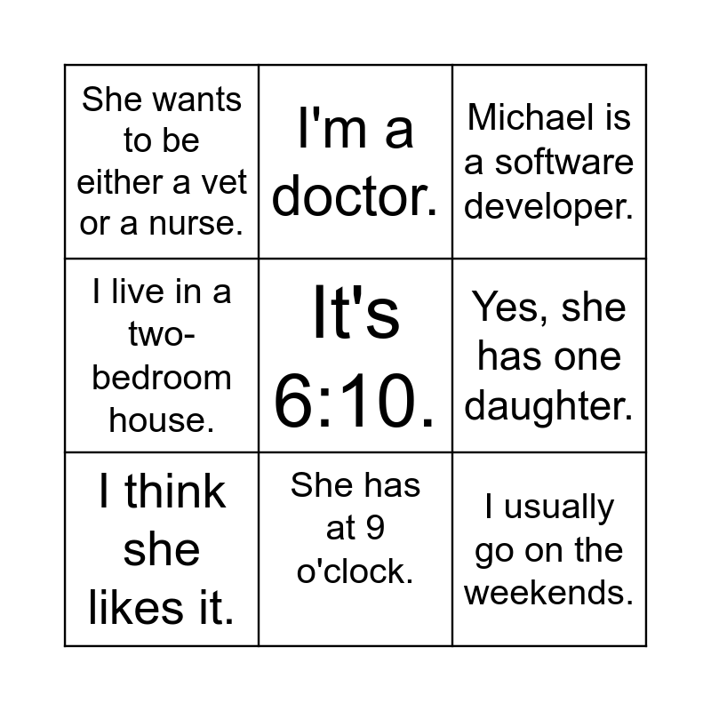 This bingo card has a free space and 14 words: She loves reading in her bedroom., She wakes up, gets dressed and then goes to work..., I think she likes it., I'm a doctor., I live in a two-bedroom house., I usually go on the weekends., She rarely goes., I go at 7 o'clock., She has at 9 o'clock., She wants to be either a vet or a nurse., She is 38 years old., Yes, she has one daughter., Michael is a software developer. and A plumber installs pipers..