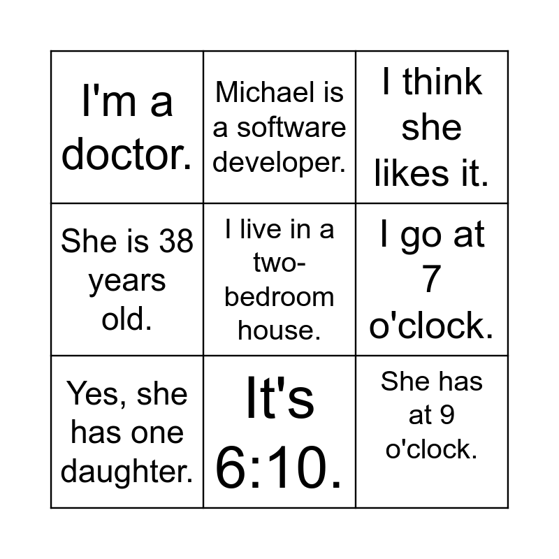 This bingo card has 15 words: She loves reading in her bedroom., She wakes up, gets dressed and then goes to work..., I think she likes it., I'm a doctor., It's 6:10., I live in a two-bedroom house., I usually go on the weekends., She rarely goes., I go at 7 o'clock., She has at 9 o'clock., She wants to be either a vet or a nurse., She is 38 years old., Yes, she has one daughter., Michael is a software developer. and A plumber installs pipers..