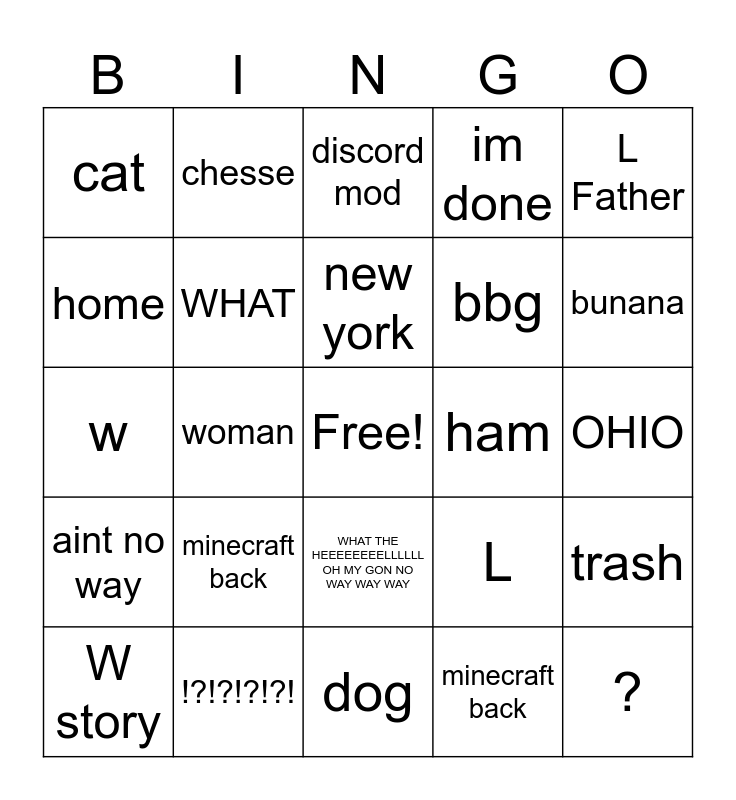 This bingo card has a free space and 25 words: minecraft back, dog, new york, W story, L Father, cat, home, chesse, ham, WHAT THE HEEEEEEEELLLLLL OH MY GON NO WAY WAY WAY, bbg, w, L, trash, WHAT, LAW, OHIO, discord mod, bunana, woman, ?, !?!?!?!?!, aint no way, im done and minecraft back.