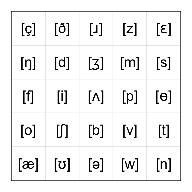 This bingo card has 25 words: [ʃ], [ə], [ʒ], [æ], [ɛ], [ç], [ŋ], [ð], [p], [b], [m], [f], [v], [t], [d], [n], [ɵ], [ɹ], [s], [i], [ʌ], [ʊ], [o], [z] and [w].