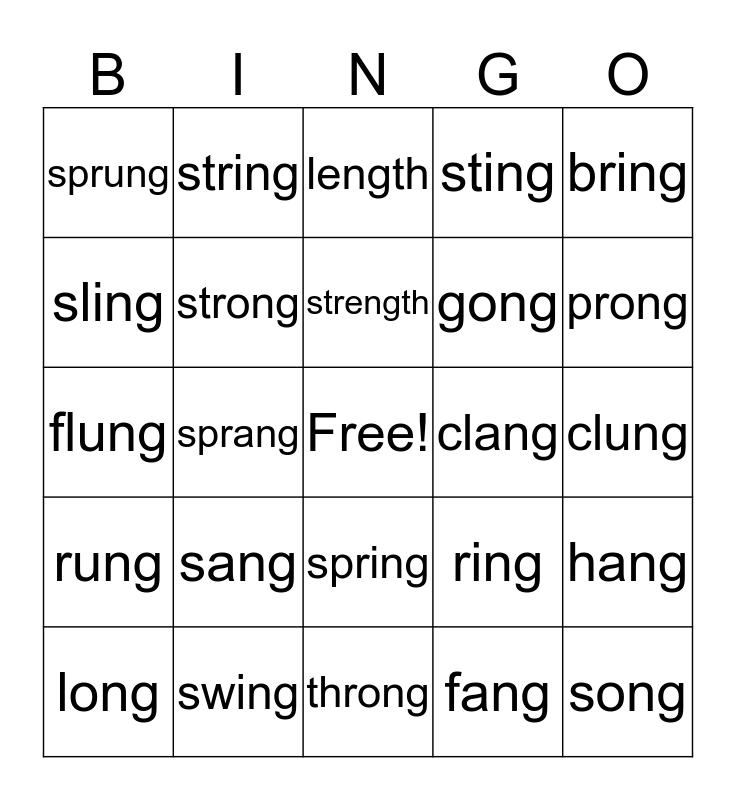 This bingo card has a free space and 24 words: sang, swing, strength, long, bring, sprung, sling, string, clang, spring, gong, flung, ring, hang, strong, fang, clung, length, prong, sprang, song, rung, sting and throng.