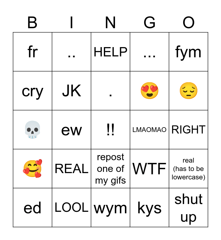 This bingo card has a free space and 24 words: ed, REAL, ., kys, fym, fr, .., HELP, LMAOMAO, RIGHT, 💀, JK, WTF, real (has to be lowercase), cry, LOOL, wym, ..., 😔, 🥰, ew, repost one of my gifs, 😍 and shut up.