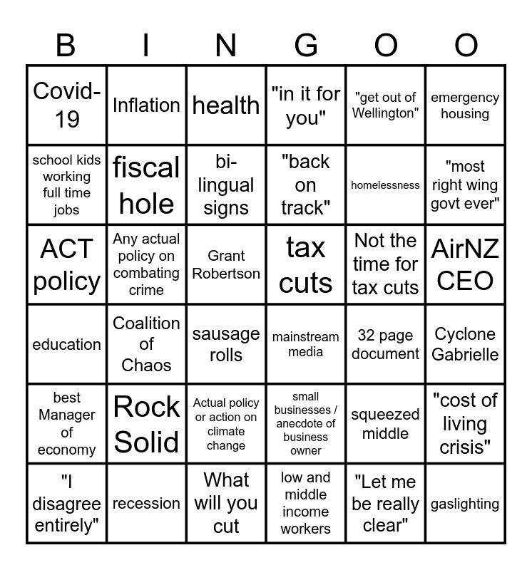 This bingo card has 75 words: Bread and Butter, Coalition of Chaos, health, Kainga ora, poverty, tough on crime, "I disagree entirely", recession, What will you cut, the economy, squeezed middle, referendums, school kids working full time jobs, fiscal hole, co-governance, "back on track", "Let me be really clear", Cyclone Gabrielle, "show me the money" / release the costings or modelling, Inflation, Actual policy or action on climate change, "in it for you", "get out of Wellington", "most right wing govt ever", Covid-19, Rock Solid, strike action, "boy from the Hutt", Coalition of Cuts, "at the end of the day", best Manager of economy, "what NZers really care about", Te Tiriti / The Treaty, mainstream media, homelessness, AirNZ CEO, Three Waters, Economists have different opinions, bi-lingual signs, low and middle income workers, Tiriti-centric, "I know numbers", JMM: Chris - (and both candidates answer), TPM policy, Greens policy, Three Strikes legislation, 32 page document, emergency housing, abortion, wealth tax, Grant Robertson, tax cuts, free dental, misinformation, renewable energy, Ministerial mishaps, sausage rolls, Nicola Willis, GST off fruit and veg, NZ First policy, ACT policy, James S and Marama D, Debbie NP and Rawiri W, Winston Peters, David Seymour, "cost of living crisis", education, housing, fair pay agreements, small businesses / anecdote of business owner, Not the time for tax cuts, gaslighting, Any actual policy on combating poverty, Any actual policy on combating crime and supermarket duopoly.