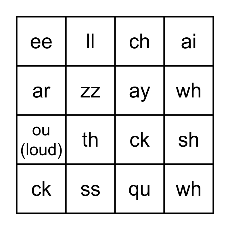 This bingo card has 24 words: sh, th, wh, ng, ar, ee, zz, ll, ss, ow (cow), ou (loud), ck, ch, oo, ay, ff, qu, ch, th, sh, ck, wh, ai and ng.