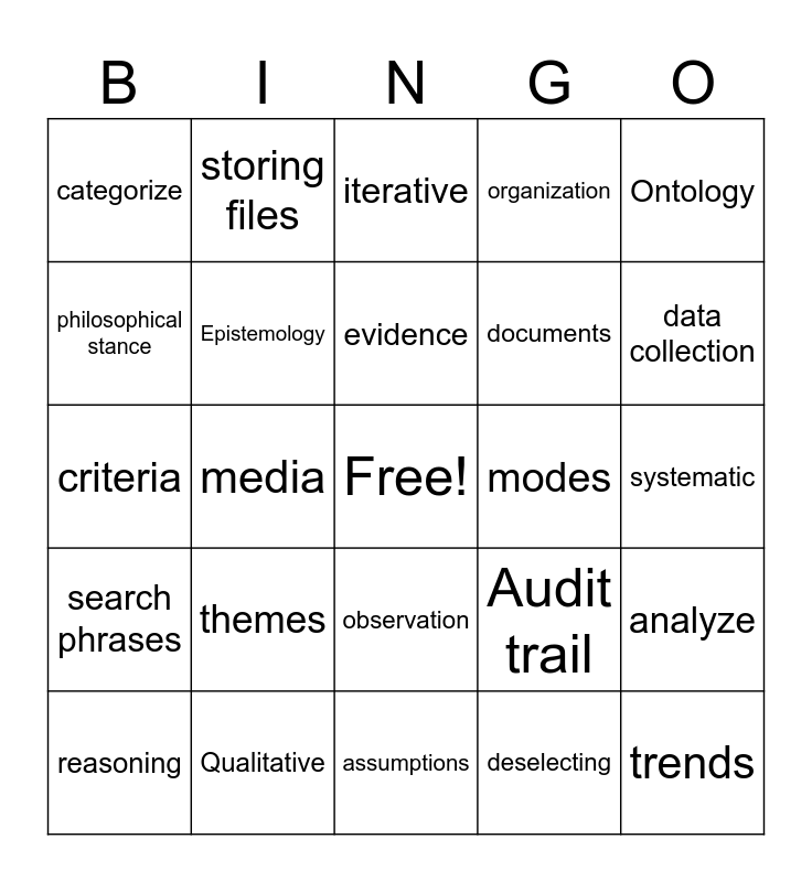 This bingo card has a free space and 70 words: literature review, systematic, ethics, methodology, Qualitative, critical examination, organization, reflection, Ontology, Themes, analyze, summarize, categorize, iterative, Axiology, media, observation, documents, experts, search phrases, modes, Audit trail, data collection, examining, storage, presenting, publishing, selecting, deselecting, initiating the search, storing files, researcher identity, culturally progressive, exploration phase, interpretation phase, communication phase, evidence-based decisions, critical examination, worldview, philosophical stance, concepts, themes, trends, background concepts, belief systems, Epistemology, reasoning, ontology, axiology, quantitative, qualitative, problem statement, thesis question, artifacts, assumptions, reason, evidence, viewpoint, implications, consequences, criteria, database, search strategies, search phrases, key terms, audit trail, storage strategies, sorting within stored files, data analysis within Excel and Excel spreadsheet.
