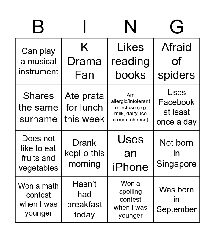 This bingo card has 38 words: Free!, Am a morning person (i.e. active in the morning), Likes to sleep in, Am allergic/intolerant to lactose (e.g. milk, dairy, ice cream, cheese), Tried more than 5 different types of bubble tea brands before, Does not like durian, Uses Facebook at least once a day, Eats fast food at least once a week, Shares the same surname, Does not like to eat fruits and vegetables, Not born in Singapore, Afraid of spiders, Won a math contest when I was younger, Won a spelling contest when I was younger, Ate prata for lunch this week, Was born in September, Black Pink Fan, Likes reading books, Afraid of cockroaches, Hasn’t had breakfast today, Can play a musical instrument, Loves Chicken Rice, Drank kopi-o this morning, Has the most letters in their last name, Enjoys Singing, Dog Person, Vegetarian, Is an only child, BTS Fan, Cat Person, Likes spicy food, Lives in the West, Uses Samsung Phone, K Drama Fan, Snores, Favorite color is Pink, Uses an iPhone and Lives in the East.