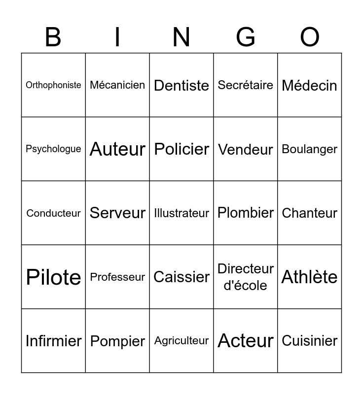 This bingo card has a free space and 24 words: Professeur, Pompier, Policier, Infirmier, Médecin, Orthophoniste, Psychologue, Mécanicien, Plombier, Caissier, Vendeur, Conducteur, Directeur d'école, Athlète, Auteur, Acteur, Chanteur, Dentiste, Boulanger, Serveur, Cuisinier, Pilote, Secrétaire and Agriculteur.