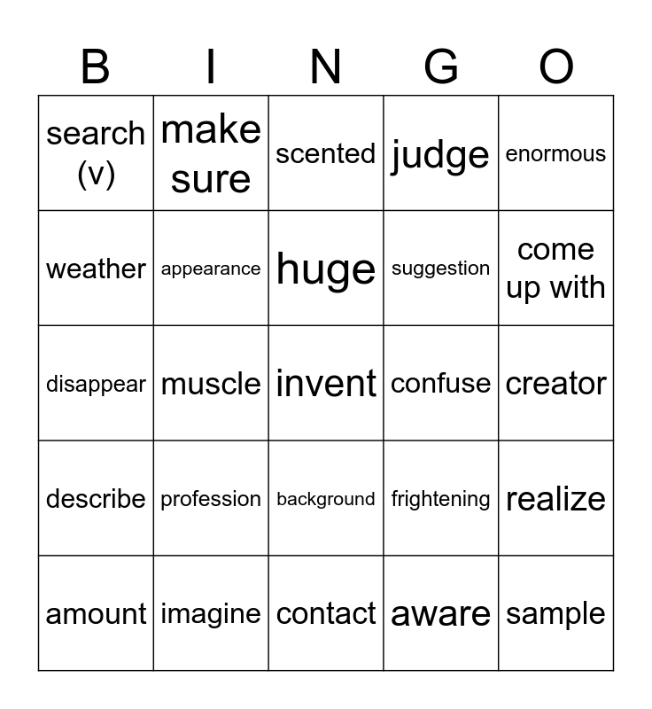 This bingo card has a free space and 29 words: amount, pollution, muscle, aim (v), search (v), scented, appearance, profession, confuse, imagine, creator, sample, contact, aware, come up with, check out, background, describe, enormous, disappear, frightening, express, suggestion, weather, judge, make sure, realize, huge and remove.