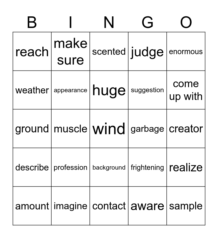 This bingo card has a free space and 29 words: amount, pollution, muscle, aim (v), reach, scented, appearance, profession, garbage, imagine, creator, sample, contact, aware, come up with, check out, background, describe, enormous, ground, frightening, express, suggestion, weather, judge, make sure, realize, huge and remove.