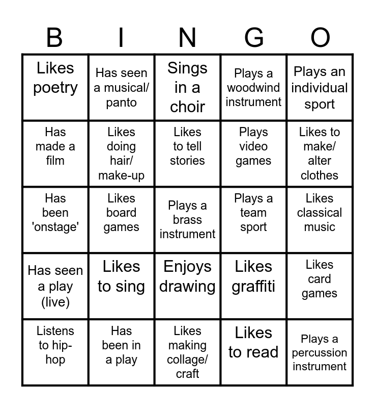 This bingo card has 34 words: Plays a percussion instrument, Likes to read, Likes to dance, Likes arts and crafts, Has seen a play (live), Likes doing hair/ make-up, Plays an individual sport, Listens to hip-hop, Has seen a musical/ panto, Likes to use ceramics/ clay, Likes to tell stories, Sings in a choir, Enjoys painting, Plays a string instrument, Plays a team sport, Likes to make/ alter clothes, Has been in a play, Has been 'onstage', Likes to sing, Likes graffiti, Enjoys drawing, Likes watching movies, Likes poetry, Likes classical music, Likes making collage/ craft, Plays a brass instrument, Plays a woodwind instrument, Likes to write stories, Plays video games, Has made a film, Likes making jewelry, Likes board games, Likes card games and Listens to EDM.