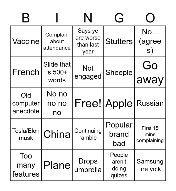 This bingo card has a free space and 24 words: China, Plane, Not engaged, Too many features, No... (agree s), Vaccine, French, Complain about attendance, Apple, Continuing ramble, Sheeple, Old computer anecdote, Popular brand bad, First 15 mins complaining, Slide that is 500+ words, People aren't doing quizes, Russian, Says ye are worse than last year, Go away, No no no no no, Samsung fire yolk, Tesla/Elon musk, Stutters and Drops umbrella.