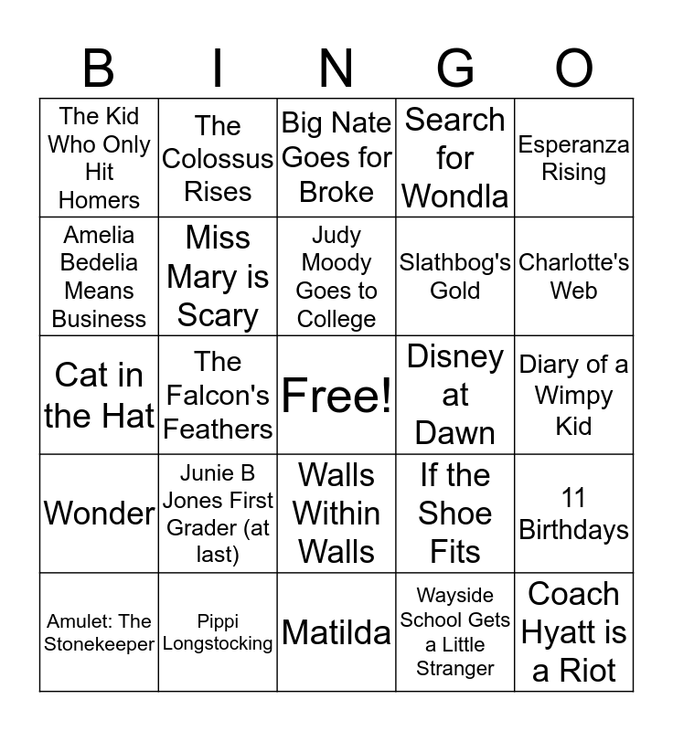 This bingo card has a free space and 24 words: Junie B Jones First Grader (at last), Pippi Longstocking, Judy Moody Goes to College, Amulet: The Stonekeeper, Esperanza Rising, The Kid Who Only Hit Homers, Amelia Bedelia Means Business, The Colossus Rises, Disney at Dawn, Walls Within Walls, Slathbog's Gold, Cat in the Hat, If the Shoe Fits, 11 Birthdays, Miss Mary is Scary, Wayside School Gets a Little Stranger, Diary of a Wimpy Kid, Big Nate Goes for Broke, Charlotte's Web, The Falcon's Feathers, Coach Hyatt is a Riot, Wonder, Search for Wondla and Matilda.