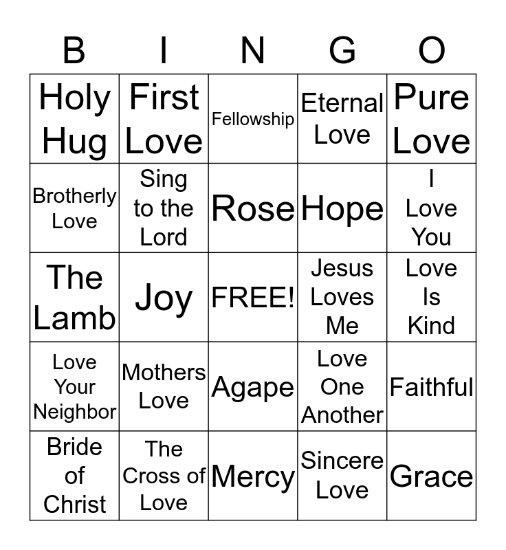This bingo card has a free space and 24 words: Mothers Love, The Cross of Love, Rose, Bride of Christ, Pure Love, Holy Hug, Brotherly Love, First Love, Jesus Loves Me, Agape, Hope, The Lamb, Love One Another, Faithful, Sing to the Lord, Sincere Love, Love Is Kind, Fellowship, I Love You, Joy, Grace, Love Your Neighbor, Eternal Love and Mercy.