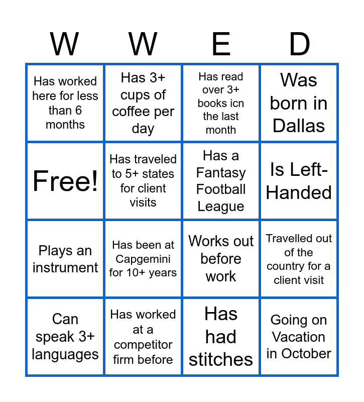 This bingo card has 16 words: Has worked at a competitor firm before, Travelled out of the country for a client visit, Has read over 3+ books icn the last month, Has worked here for less than 6 months, Plays an instrument, Has 3+ cups of coffee per day, Works out before work, Has had stitches, Free!, Has traveled to 5+ states for client visits, Can speak 3+ languages, Was born in Dallas, Has been at Capgemini for 10+ years, Is Left-Handed, Has a Fantasy Football League and Going on Vacation in October.