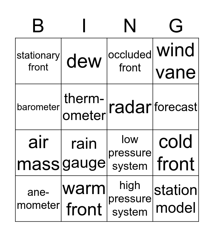 This bingo card has 16 words: warm front, cold front, occluded front, stationary front, air mass, dew, low pressure system, high pressure system, barometer, therm-ometer, ane- mometer, wind vane, rain gauge, forecast, radar and station model.