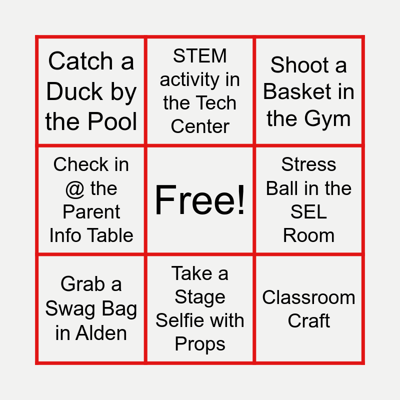 This bingo card has a free space and 8 words: Stress Ball in the SEL Room, Shoot a Basket in the Gym, STEM activity in the Tech Center, Grab a Swag Bag in Alden, Catch a Duck by the Pool, Classroom Craft, Check in @ the Parent Info Table and Take a Stage Selfie with Props.