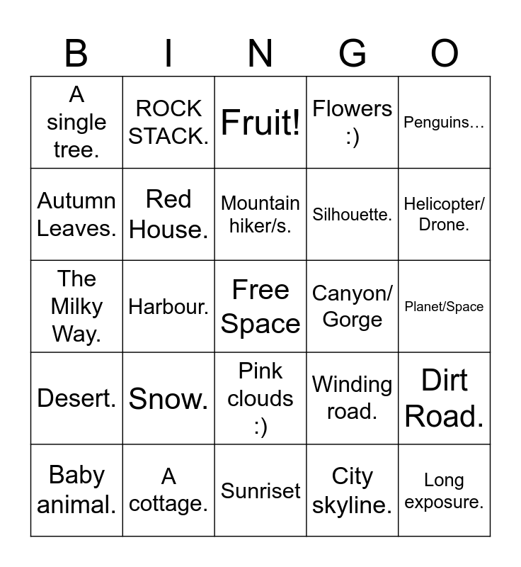 This bingo card has a free space and 39 words: The northern lights!, Ruins…, Mountain Scape., Red House., Baby animal., Pink clouds :), Mountain hiker/s., Horses!, Penguins…, Desert., Harbour., Flowers :), Long exposure., Planet/Space, Canyon/ Gorge, Snow., Lightning., A single tree., Clear sky., Winding road., Autumn Leaves., Sunriset, Silhouette., Helicopter/ Drone., River., Moss., Splash!, Dense, Dark Forest., Running animal., ROCK STACK., Log., Farm land., Fruit!, A cottage., City skyline., Rolling hills., Dirt Road., The Milky Way. and Fog….