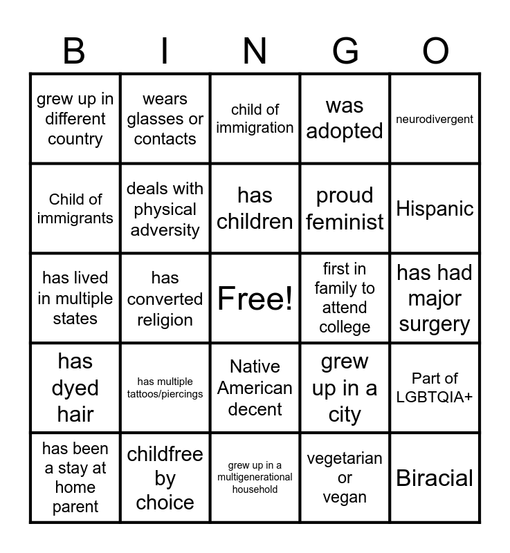 This bingo card has a free space and 24 words: has multiple tattoos/piercings, childfree by choice, has children, has been a stay at home parent, neurodivergent, grew up in different country, Child of immigrants, wears glasses or contacts, first in family to attend college, Native American decent, proud feminist, has lived in multiple states, grew up in a city, Part of LGBTQIA+, deals with physical adversity, vegetarian or vegan, has had major surgery, child of immigration, Hispanic, has converted religion, Biracial, has dyed hair, was adopted and grew up in a multigenerational household.