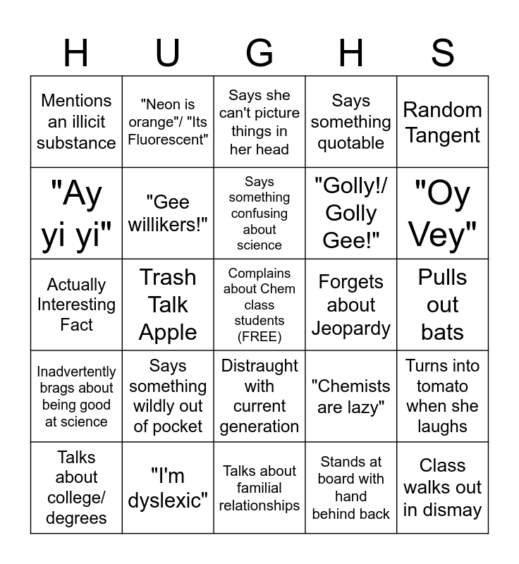 This bingo card has a free space and 24 words: Says something wildly out of pocket, "I'm dyslexic", Says something confusing about science, Talks about college/ degrees, Random Tangent, Mentions an illicit substance, "Ay yi yi", "Neon is orange"/ "Its Fluorescent", Forgets about Jeopardy, Distraught with current generation, "Golly!/ Golly Gee!", Actually Interesting Fact, "Chemists are lazy", Turns into tomato when she laughs, "Gee willikers!", Stands at board with hand behind back, Pulls out bats, Says she can't picture things in her head, "Oy Vey", Trash Talk Apple, Class walks out in dismay, Inadvertently brags about being good at science, Says something quotable and Talks about familial relationships.