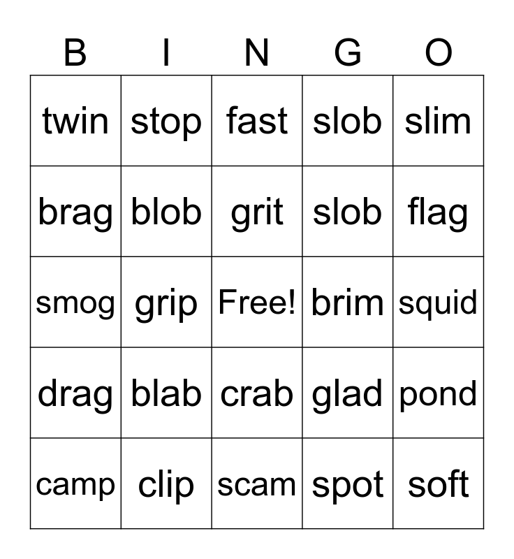 This bingo card has a free space and 25 words: blab, scam, grit, camp, slim, twin, brag, stop, brim, crab, slob, smog, glad, pond, blob, snip, squid, fast, flag, grip, soft, clip, drag, slob and spot.