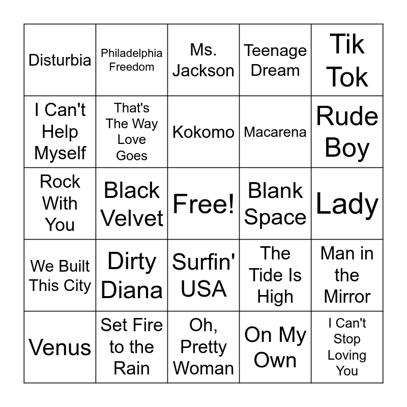 This bingo card has a free space and 24 words: Dirty Diana, Set Fire to the Rain, Kokomo, Venus, Tik Tok, Disturbia, I Can't Help Myself, Philadelphia Freedom, Blank Space, Surfin' USA, Macarena, Rock With You, The Tide Is High, Man in the Mirror, That's The Way Love Goes, On My Own, Lady, Ms. Jackson, Rude Boy, Black Velvet, I Can't Stop Loving You, We Built This City, Teenage Dream and Oh, Pretty Woman.