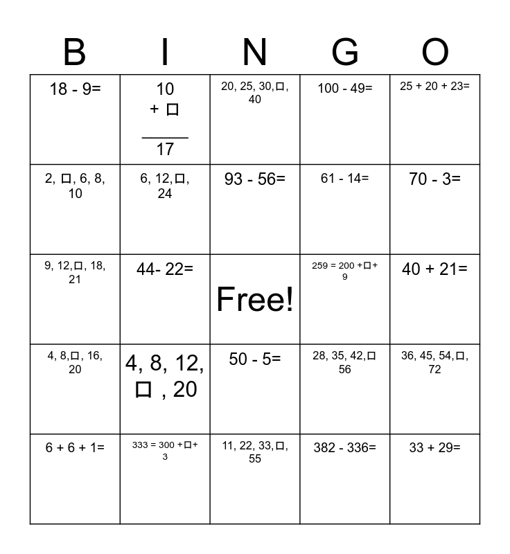 This bingo card has a free space and 50 words: 40 + ロ ____ 41, 4, 8, 12, ロ , 20, 102 - 71=, 382 - 336=, 40 + 21=, The number in the tens place of 4,031, 10 + ロ _____ 17, 29 + 3=, 61 - 14=, 33 + 29=, 2, ロ, 6, 8, 10, 6, 12,ロ, 24, 28, 35, 42,ロ 56, 36, 45, 54,ロ, 72, 18 - 11=, 309 - 288=, 20, 25, 30,ロ, 40, 259 = 200 +ロ+ 9, 33 + 30 + 2=, 18 - 9=, 44- 22=, 24,ロ, 48, 60, 72, 100 - 49=, 70 - 3=, 815 = 800 +ロ+ 5, 11 + 12=, 93 - 56=, 30 + 22=, 25 + 20 + 23=, 4, 8,ロ, 16, 20, 10, 15, 20,ロ, 30, 30 + 8=, 15 + 39=, 879 = 800 +ロ+ 9, 6 + 6 + 1=, 83 - 57=, 247 = 200 +ロ+ 7, 260 - 5 - 200=, 180 - 9 - 100=, 9, 12,ロ, 18, 21, 11 + 18=, 36 + 6=, 59 - 1=, 83 - 10=, 333 = 300 +ロ+ 3, 11, 22, 33,ロ, 55, 126 - 67=, 100 - 25=, 50 - 5= and 867 = 800 +ロ+ 7.