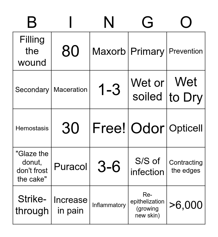 This bingo card has a free space and 24 words: Puracol, Increase in pain, 1-3, Strike-through, Prevention, Filling the wound, Secondary, 80, Odor, 3-6, Wet or soiled, Hemostasis, S/S of infection, Contracting the edges, Maceration, Re-epithelization (growing new skin), Opticell, Maxorb, Wet to Dry, 30, >6,000, "Glaze the donut, don't frost the cake", Primary and Inflammatory.