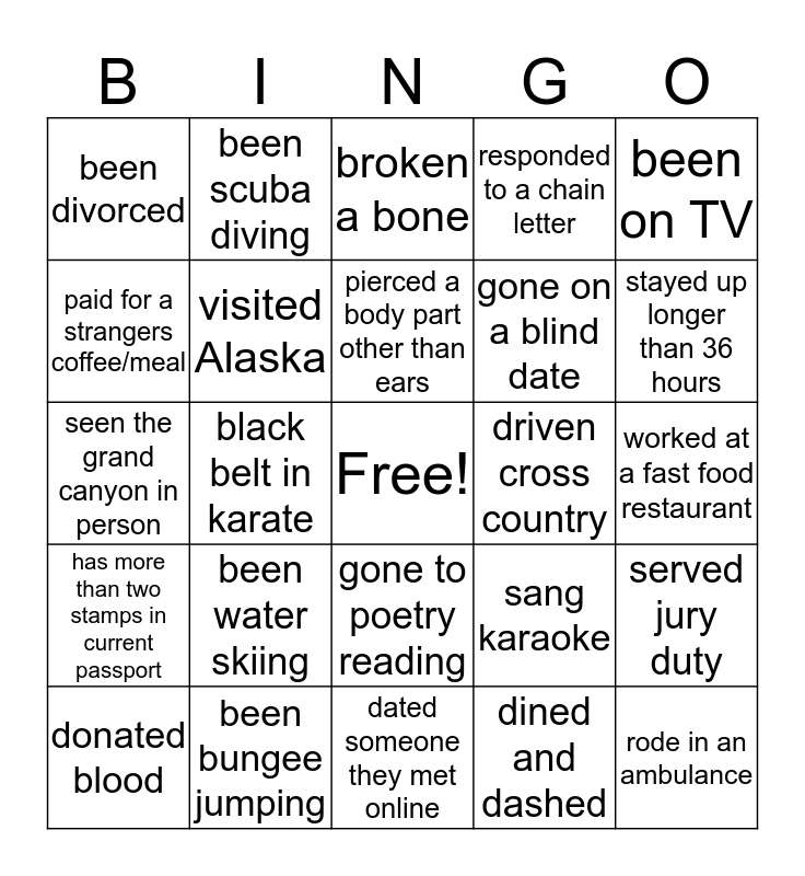 This bingo card has a free space and 24 words: been water skiing, been bungee jumping, pierced a body part other than ears, donated blood, been on TV, been divorced, paid for a strangers coffee/meal, been scuba diving, driven cross country, gone to poetry reading, gone on a blind date, seen the grand canyon in person, sang karaoke, served jury duty, visited Alaska, dined and dashed, worked at a fast food restaurant, broken a bone, stayed up longer than 36 hours, black belt in karate, rode in an ambulance, has more than two stamps in current passport, responded to a chain letter and dated someone they met online.