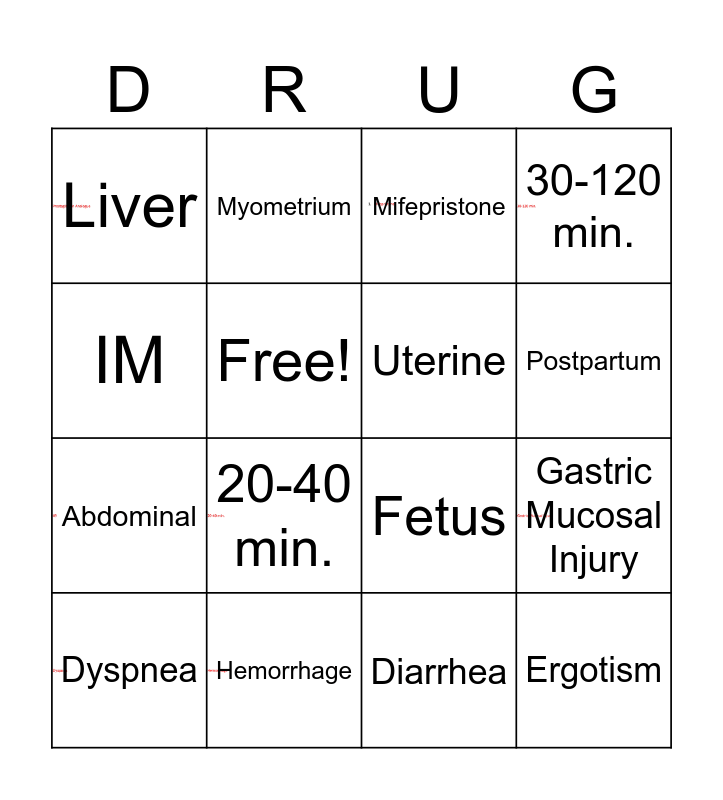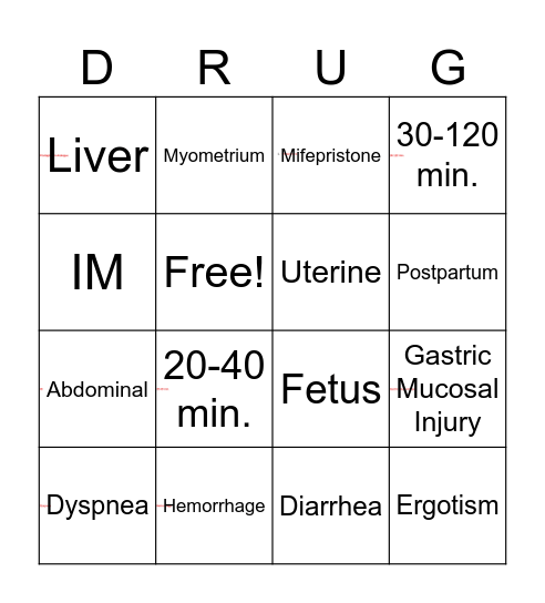 This bingo card has 8 images and 16 words: Hemorrhage, Gastric Mucosal Injury, Mifepristone, Liver, Abdominal, Myometrium, Fetus, Diarrhea, IM, Free!, Dyspnea, 30-120 min., 20-40 min., Postpartum, Uterine and Ergotism.