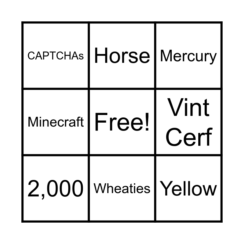 This bingo card has a free space and 41 words: Android, Seven, Ten, 2,000, 2.5M, 6/30/2000, Wheaties, None, Yellow, iPhone, Delta, Minecraft, Diamond, Alaska, Galaxy, Roomba, Titanic, CAPTCHAs, 23%, Mercury, Pokemon Go, Redwoods, Mount Everest, 26, Skin, Books, Summer, Cars, Mosaic, Facebook, Cheetah, Horse, Canada, Cinderella, Benjamin Franklin, Vint Cerf, Neil Papworth, Green, Ears, Bananas and The Simpsons.