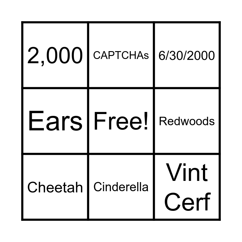 This bingo card has a free space and 41 words: Cars, Mosaic, Facebook, Cheetah, Horse, Canada, Cinderella, Benjamin Franklin, Vint Cerf, Neil Papworth, Green, Ears, Bananas, The Simpsons, Android, Seven, Ten, 2,000, 2.5M, 6/30/2000, Wheaties, None, Yellow, iPhone, Delta, Minecraft, Diamond, Alaska, Galaxy, Roomba, Titanic, CAPTCHAs, 23%, Mercury, Pokemon Go, Redwoods, Mount Everest, 26, Skin, Books and Summer.