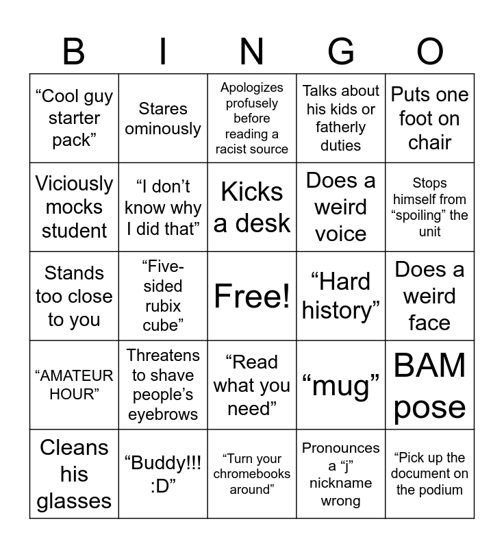 This bingo card has a free space and 24 words: Threatens to shave people’s eyebrows, “Buddy!!! :D”, Kicks a desk, Cleans his glasses, Puts one foot on chair, “Cool guy starter pack”, Viciously mocks student, Stares ominously, “Hard history”, “Read what you need”, Does a weird voice, Stands too close to you, “mug”, BAM pose, “I don’t know why I did that”, Pronounces a “j” nickname wrong, Does a weird face, Apologizes profusely before reading a racist source, Stops himself from “spoiling” the unit, “Five-sided rubix cube”, “Pick up the document on the podium, “AMATEUR HOUR”, Talks about his kids or fatherly duties and “Turn your chromebooks around”.