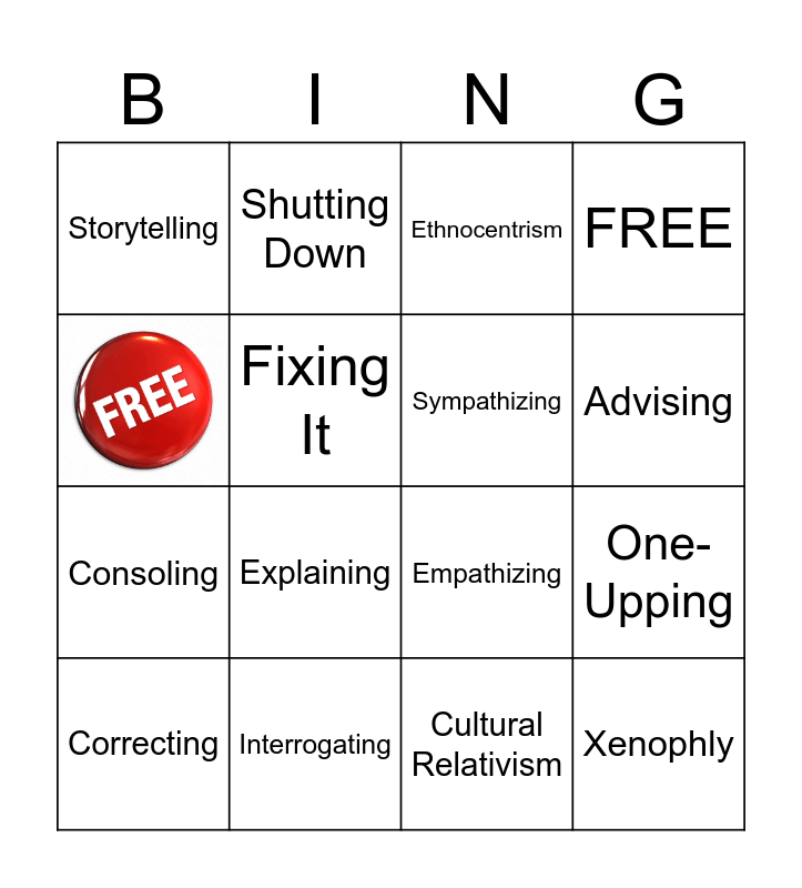 This bingo card has 1 images and 15 words: Interrogating, One-Upping, Ethnocentrism, Storytelling, Consoling, Shutting Down, Empathizing, Cultural Relativism, Fixing It, Correcting, FREE, Explaining, Advising, Sympathizing and Xenophly.