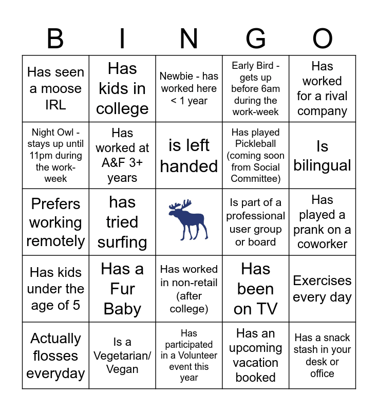 This bingo card has a free space and 40 words: Doesn't drink coffee, Prefers working remotely, Has played Cricket or will be playing Cricket today, Has worked at A&F 3+ years, Is a Vegetarian/ Vegan, Has worked in non-retail (after college), is left handed, Has a work playlist, Has worked for a rival company, Has kids under the age of 5, has tried surfing, Early Bird - gets up before 6am during the work-week, Has a snack stash in your desk or office, Has played a prank on a coworker, Is part of a professional user group or board, Has a Fur Baby, Prefers working in the office, Has seen a moose IRL, Has worn PJ bottoms during a Teams meeting, Newbie - has worked here < 1 year, Exercises every day, Has an upcoming vacation booked, Has played Pickleball (coming soon from Social Committee), Night Owl - stays up until 11pm during the work-week, Played a sport in college, Doesn't wear contacts or glasses, Has completed a marathon, Has met a celebrity, Doesn't live in Ohio, Can play an instrument, Has a birthday this month, Actually flosses everyday, Can't start the day without coffee, Has been on TV, Is bilingual, Has participated in a Volunteer event this year, Considers yourself a foodie or talented cook, Listens to podcasts, Has kids in college and Is adventure-seeking.
