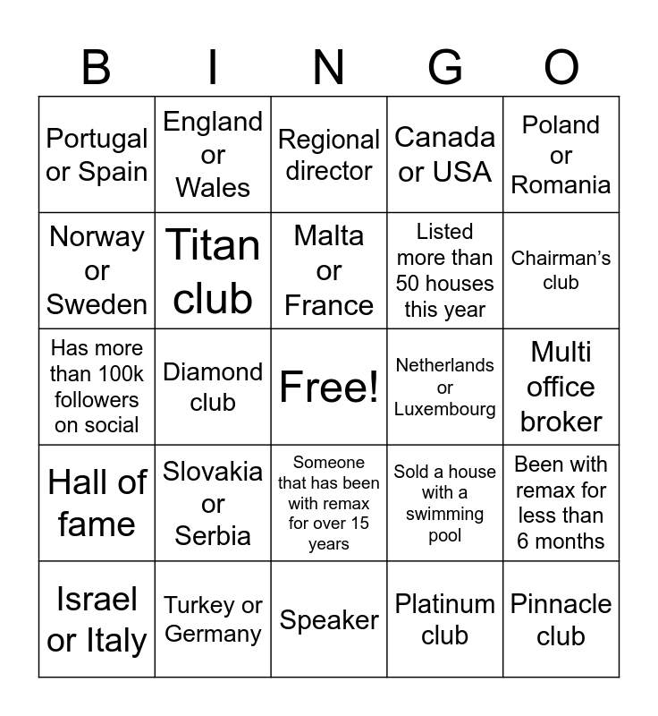 This bingo card has a free space and 24 words: Slovakia or Serbia, Turkey or Germany, Malta or France, Israel or Italy, Poland or Romania, Portugal or Spain, Norway or Sweden, England or Wales, Netherlands or Luxembourg, Someone that has been with remax for over 15 years, Listed more than 50 houses this year, Has more than 100k followers on social, Sold a house with a swimming pool, Been with remax for less than 6 months, Titan club, Platinum club, Multi office broker, Regional director, Chairman’s club, Diamond club, Pinnacle club, Hall of fame, Canada or USA and Speaker.