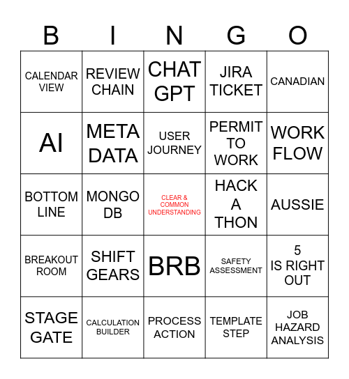 This bingo card has a free space and 24 words: SHIFT GEARS, CALCULATION BUILDER, USER JOURNEY, STAGE GATE, CANADIAN, CALENDAR VIEW, AI, REVIEW CHAIN, HACK A THON, BRB, PERMIT TO WORK, BOTTOM LINE, SAFETY ASSESSMENT, 5 IS RIGHT OUT, META DATA, TEMPLATE STEP, AUSSIE, CHAT GPT, WORK FLOW, MONGO DB, JOB HAZARD ANALYSIS, BREAKOUT ROOM, JIRA TICKET and PROCESS ACTION.