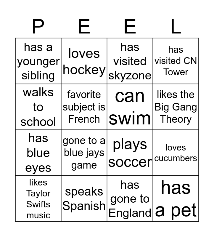 This bingo card has 16 words: speaks Spanish, loves cucumbers, has visited skyzone, has a younger sibling, has blue eyes, loves hockey, plays soccer, has gone to England, walks to school, favorite subject is French, likes Taylor Swifts music, has visited CN Tower, gone to a blue jays game, likes the Big Gang Theory, can swim and has a pet.