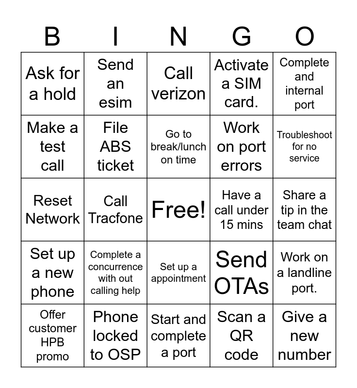 This bingo card has a free space and 24 words: Complete a concurrence with out calling help, Phone locked to OSP, Go to break/lunch on time, Offer customer HPB promo, Complete and internal port, Ask for a hold, Make a test call, Send an esim, Have a call under 15 mins, Set up a appointment, Work on port errors, Reset Network, Send OTAs, Work on a landline port., File ABS ticket, Scan a QR code, Share a tip in the team chat, Call verizon, Troubleshoot for no service, Call Tracfone, Give a new number, Set up a new phone, Activate a SIM card. and Start and complete a port.