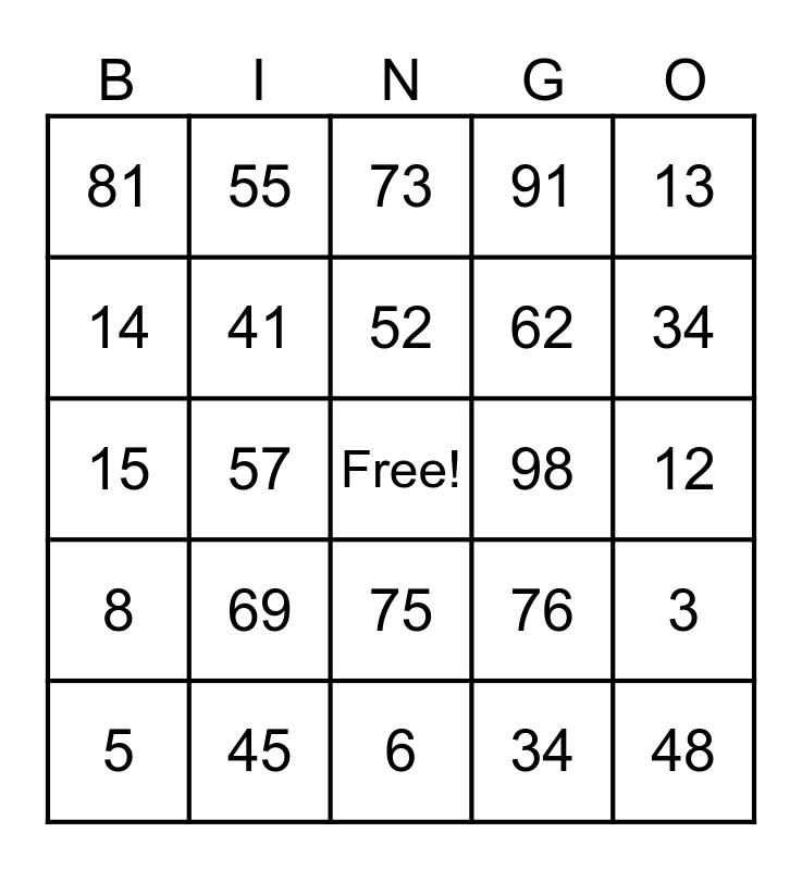 This bingo card has a free space and 24 words: 69, 45, 52, 5, 13, 81, 14, 55, 98, 75, 62, 15, 76, 3, 41, 34, 12, 73, 34, 57, 48, 8, 91 and 6.