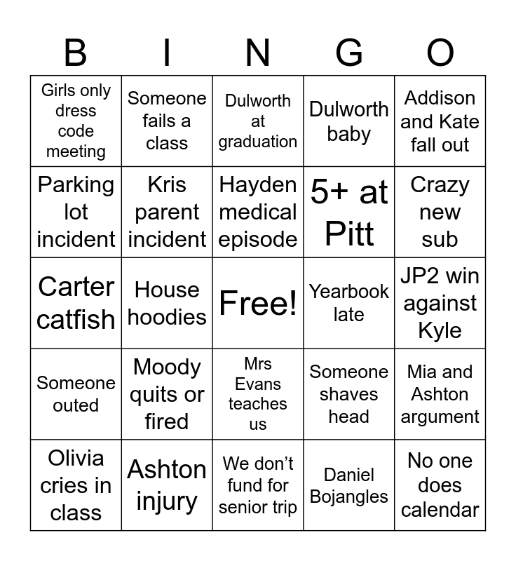 This bingo card has a free space and 24 words: Moody quits or fired, Ashton injury, Hayden medical episode, Olivia cries in class, Addison and Kate fall out, Girls only dress code meeting, Parking lot incident, Someone fails a class, Yearbook late, Mrs Evans teaches us, 5+ at Pitt, Carter catfish, Someone shaves head, Mia and Ashton argument, Kris parent incident, Daniel Bojangles, JP2 win against Kyle, Dulworth at graduation, Crazy new sub, House hoodies, No one does calendar, Someone outed, Dulworth baby and We don’t fund for senior trip.