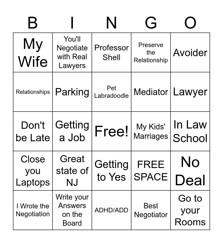 This bingo card has a free space and 25 words: Great state of NJ, ADHD/ADD, Pet Labradoodle, I Wrote the Negotiation, Avoider, My Wife, Relationships, You'll Negotiate with Real Lawyers, My Kids' Marriages, Getting to Yes, Mediator, Don't be Late, FREE SPACE, No Deal, Parking, Wharton Professor, In Law School, Professor Shell, Lawyer, Getting a Job, Go to your Rooms, Write your Answers on the Board, Close you Laptops, Preserve the Relationship and Best Negotiator.