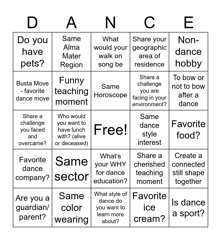 This bingo card has a free space and 24 words: Same sector, Same color wearing, Same Horoscope, Are you a guardian/ parent?, Non-dance hobby, Do you have pets?, Busta Move - favorite dance move, Same Alma Mater Region, Same dance style interest, What’s your WHY for dance education?, Share a challenge you are facing in your environment?, Share a challenge you faced and overcame?, Share a cherished teaching moment, Create a connected still shape together, Funny teaching moment, Favorite ice cream?, Favorite food?, What would your walk on song be, To bow or not to bow after a dance, Who would you want to have lunch with? (alive or deceased), Is dance a sport?, Favorite dance company?, Share your geographic area of residence and What style of dance do you want to learn more about?.