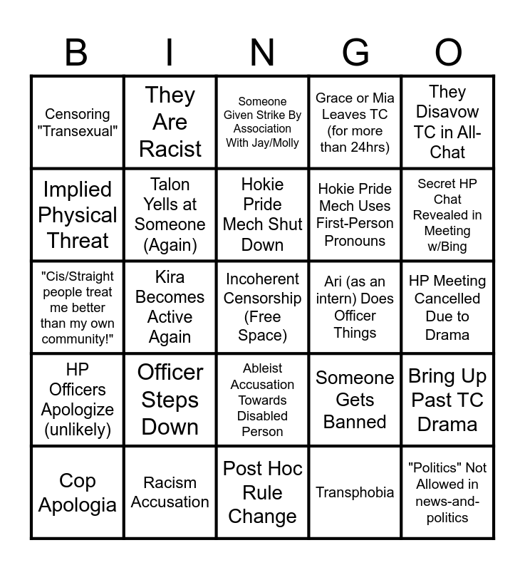 This bingo card has a free space and 24 words: Officer Steps Down, Racism Accusation, Hokie Pride Mech Shut Down, Cop Apologia, They Disavow TC in All-Chat, Censoring "Transexual", Implied Physical Threat, They Are Racist, Ari (as an intern) Does Officer Things, Ableist Accusation Towards Disabled Person, Hokie Pride Mech Uses First-Person Pronouns, "Cis/Straight people treat me better than my own community!", Someone Gets Banned, Bring Up Past TC Drama, Talon Yells at Someone (Again), Transphobia, HP Meeting Cancelled Due to Drama, Someone Given Strike By Association With Jay/Molly, Secret HP Chat Revealed in Meeting w/Bing, Kira Becomes Active Again, "Politics" Not Allowed in news-and-politics, HP Officers Apologize (unlikely), Grace or Mia Leaves TC (for more than 24hrs) and Post Hoc Rule Change.
