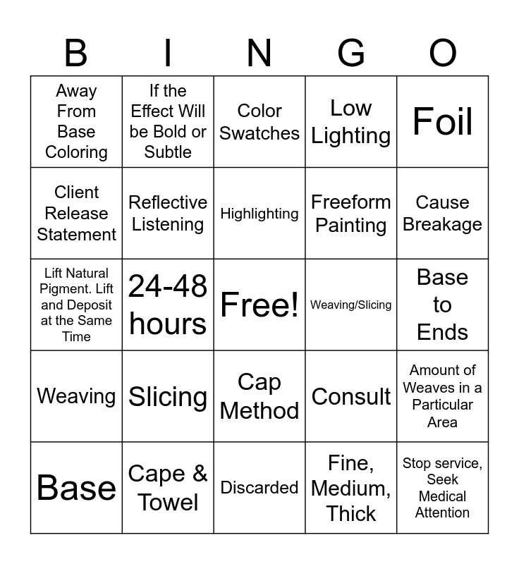 This bingo card has a free space and 24 words: Slicing, Cape & Towel, Highlighting, Base, Foil, Away From Base Coloring, Client Release Statement, If the Effect Will be Bold or Subtle, Weaving/Slicing, Cap Method, Freeform Painting, Lift Natural Pigment. Lift and Deposit at the Same Time, Consult, Amount of Weaves in a Particular Area, Reflective Listening, Fine, Medium, Thick, Base to Ends, Color Swatches, Cause Breakage, 24-48 hours, Stop service, Seek Medical Attention, Weaving, Low Lighting and Discarded.
