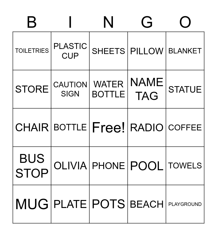 This bingo card has a free space and 34 words: BATHROOM, BEACH, MATRESS, BROOM, BUS STOP, CAUTION SIGN, BLANKET, MUG, PLASTIC CUP, FITNESS CENTER, WATER BOTTLE, SHEETS, ROOFTOP, RAG, RADIO, STATUE, PLATE, CHAIR, OLIVIA, POOL, PHONE, TOILET PEPER, TOILETRIES, COFFEE, POTS, PLAYGROUND, PILLOW, PEN, NAME TAG, STORE, TV, BOTTLE, TOWELS and THE BOSS.