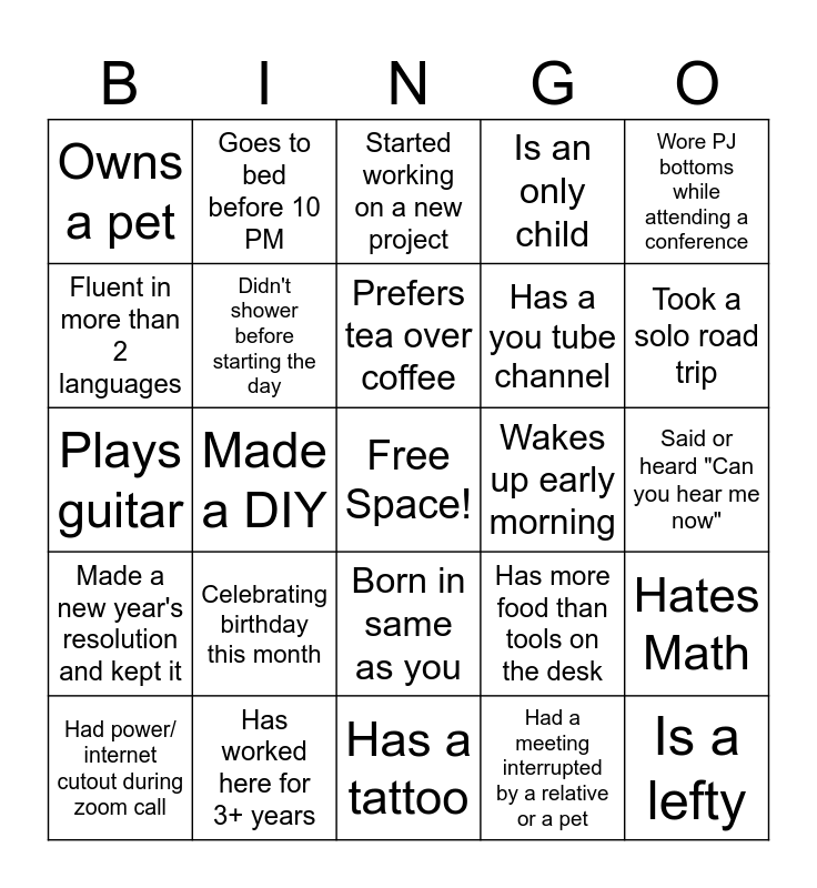 This bingo card has a free space and 24 words: Celebrating birthday this month, Has worked here for 3+ years, Prefers tea over coffee, Had power/ internet cutout during zoom call, Wore PJ bottoms while attending a conference, Owns a pet, Fluent in more than 2 languages, Goes to bed before 10 PM, Wakes up early morning, Born in same as you, Has a you tube channel, Plays guitar, Has more food than tools on the desk, Hates Math, Didn't shower before starting the day, Had a meeting interrupted by a relative or a pet, Said or heard "Can you hear me now", Started working on a new project, Took a solo road trip, Made a DIY, Is a lefty, Made a new year's resolution and kept it, Is an only child and Has a tattoo.