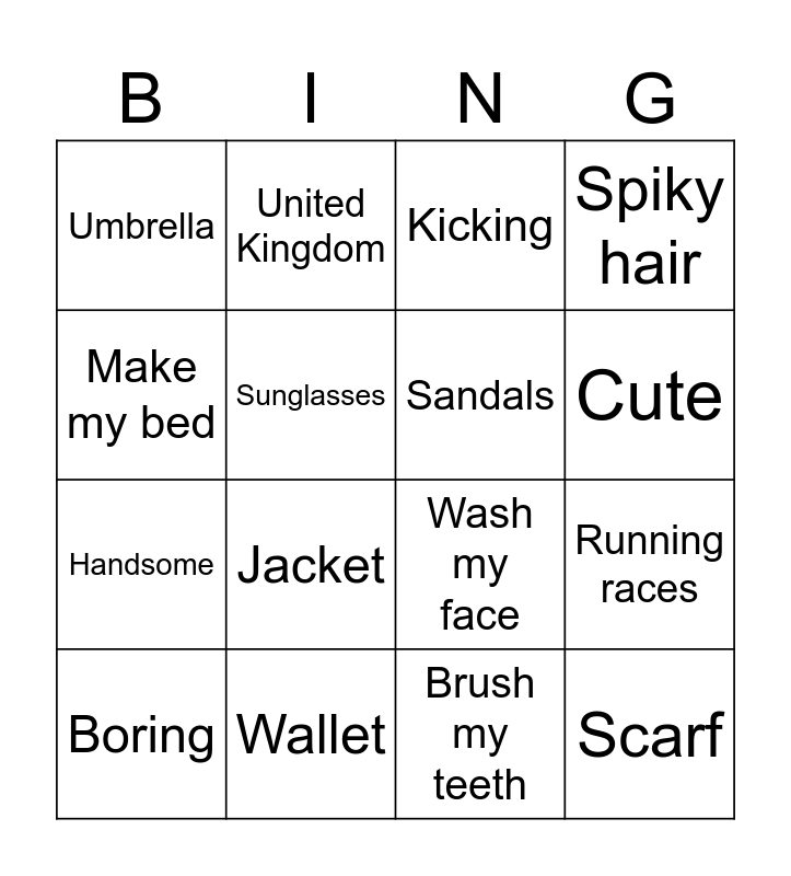 This bingo card has 26 words: Free!, Australia, Cute, Bald, Make my bed, Umbrella, Sunglasses, United Kingdom, Brush my teeth, Meet my friends, Handsome, Wash my face, Lazy, Hitting, Running races, Egypt, Spiky hair, Scarf, Kicking, Boring, Jacket, Straight hair, Wallet, Meet my friends, Sandals and Mexico.
